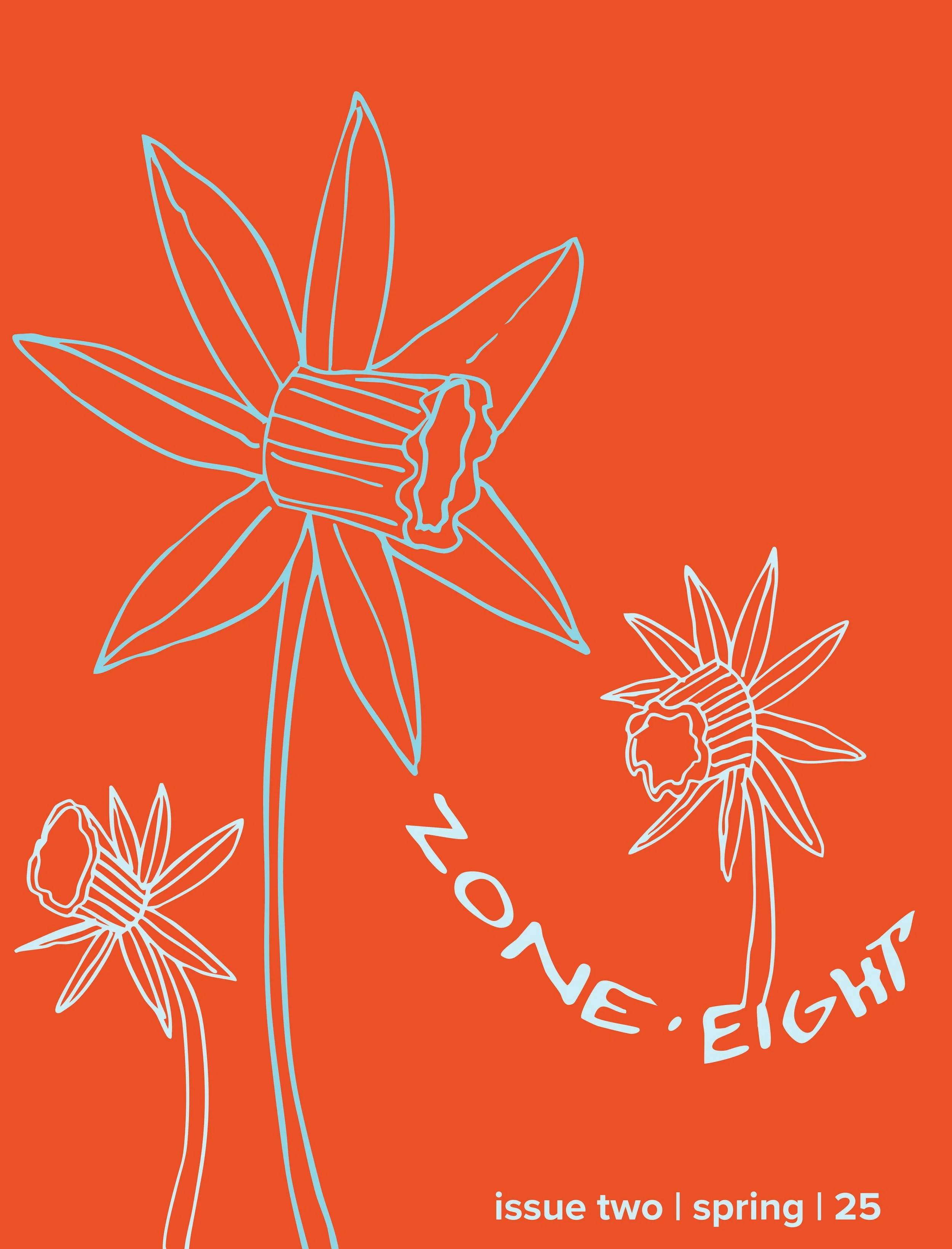Zone 8 zine cover with red background and light blue line drawings of three daffodils in different sizes