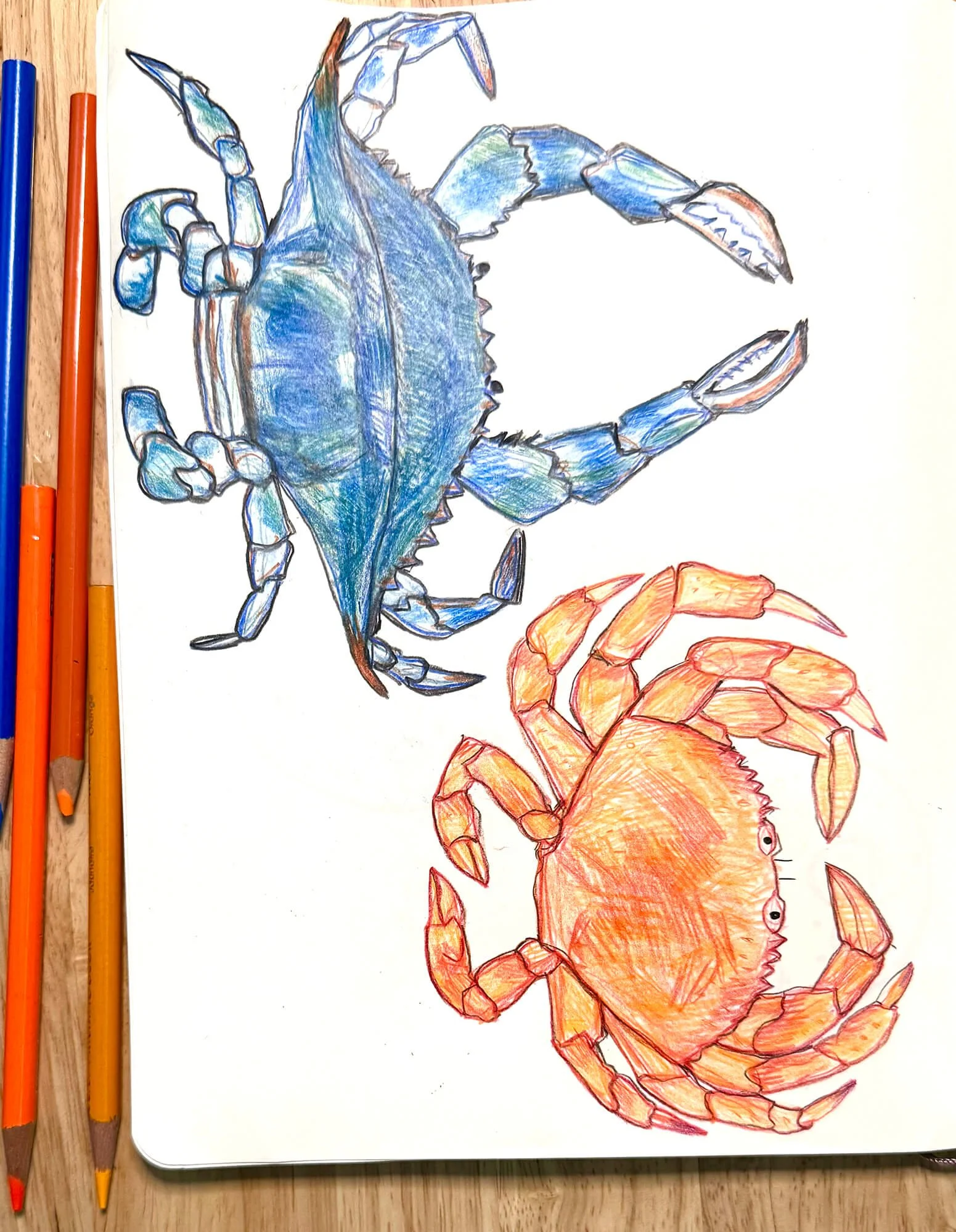 Colored Pencil Drawing of crabs, one blue and one red, inside a sketchbook.