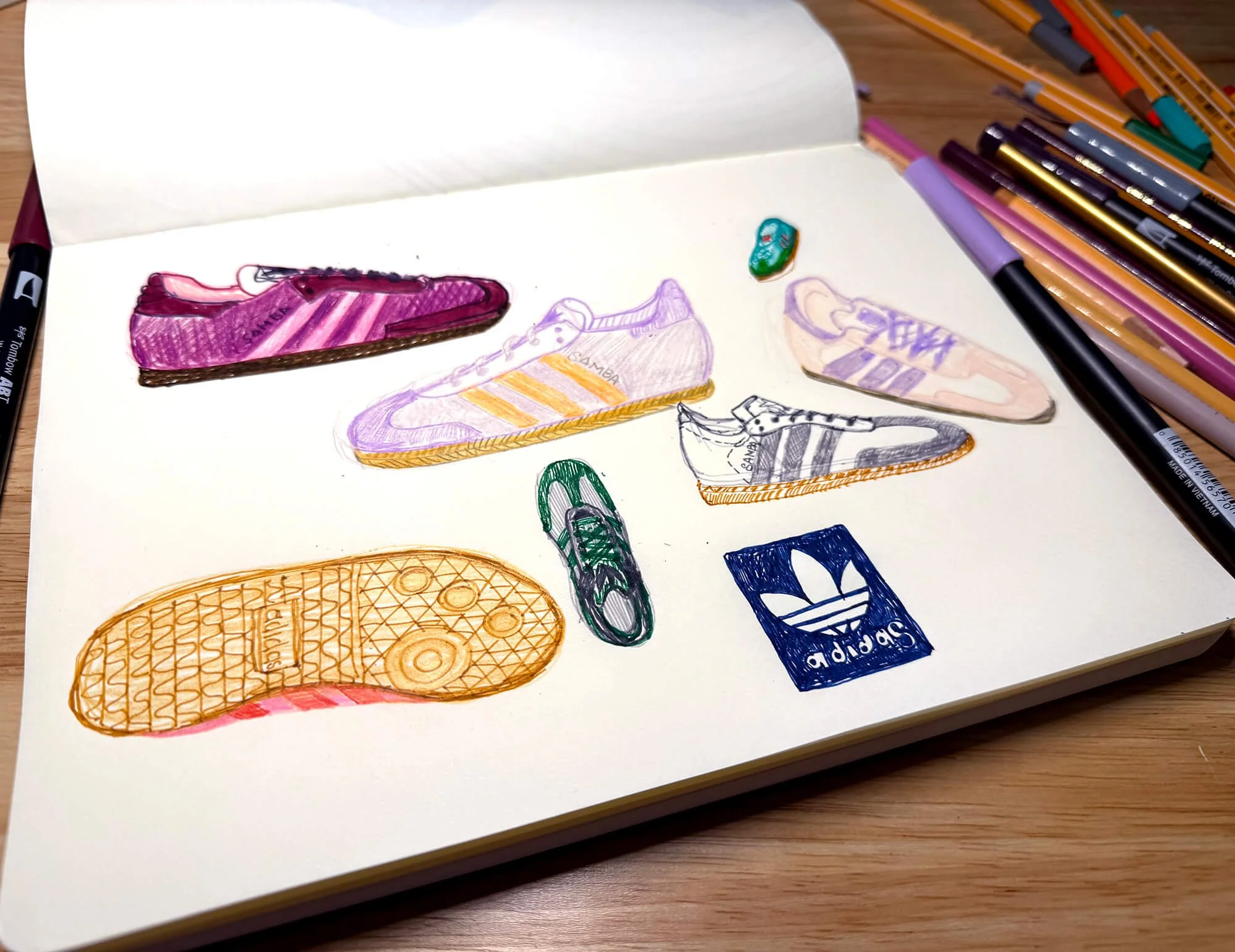 Multiple drawings of adidas sambas in a sketchbook